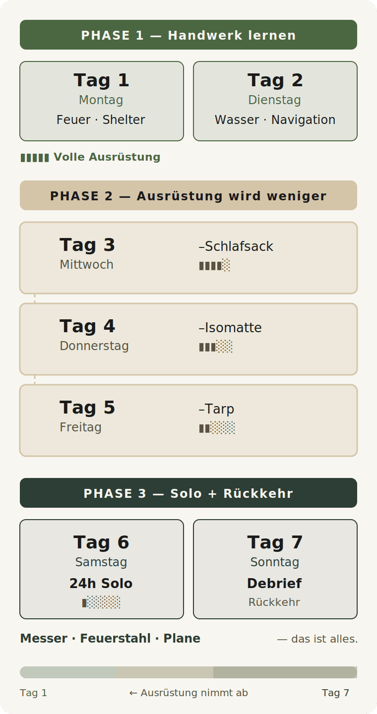 Sieben Tage Survival Training im Wald. Du versorgst dich selbst — kein Supermarkt, kein Handyempfang. Was du brauchst, holst du dir aus dem Wald. Ab dem dritten Tag wird die Ausrüstung weniger. Jedes entfernte Stück wird durch einen Skill ersetzt, den du in den Tagen davor trainiert hast. Am sechsten Tag stehst du allein im Brandenburger Wald: Messer, Feuerstahl, eine Plane — und alles, was du in fünf Tagen gelernt hast.