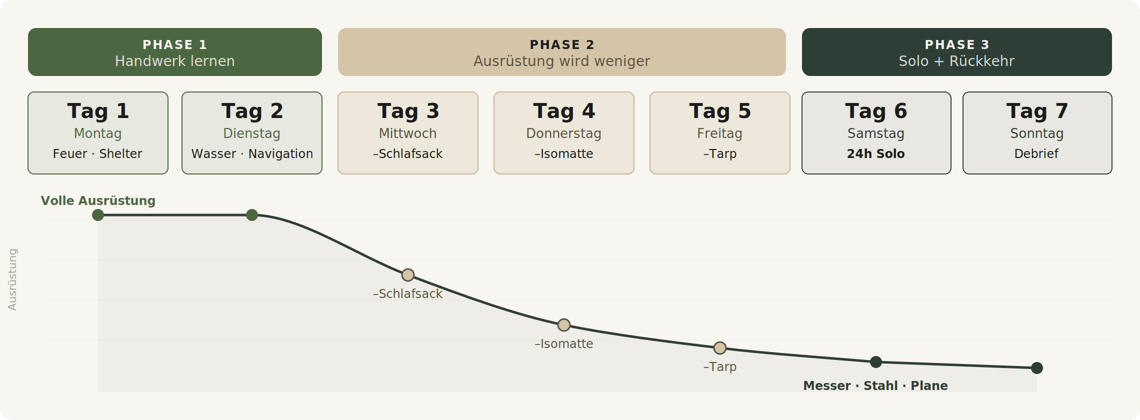 Sieben Tage im Wald — ein Survival Camp, das aufeinander aufbaut. Du versorgst dich selbst — kein Supermarkt, kein Handyempfang. Was du brauchst, holst du dir aus dem Wald. Diese Woche hat eine Architektur. Sie beginnt mit allem, was du brauchst. Und dann wird es weniger.