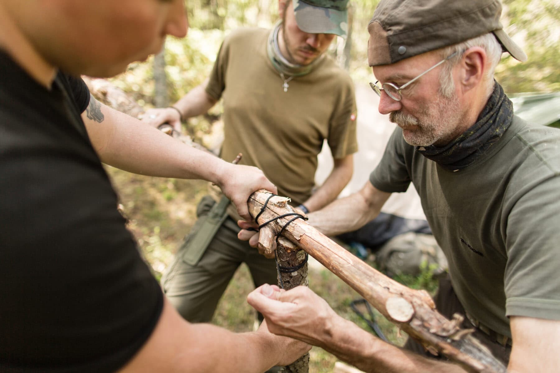 Feuer, Shelter, Wasser, Orientierung. Kein Vortrag, keine Theorie. Du machst es selbst — mit deinen Händen, mit dem, was der Wald hergibt. Dazu kommt Erste Hilfe im Feld — nicht der Kurs im Seminarraum, sondern Wundversorgung mit dem, was da ist. Und Werkzeughandwerk: Schnüre drehen, Schnitzen, Materialien verarbeiten.